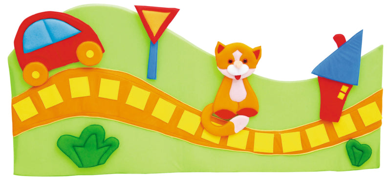 Een wanddecoratie in levendige heldere kleuren. Bepaalde elementen zijn permanent bevestigd aan het tapijt.