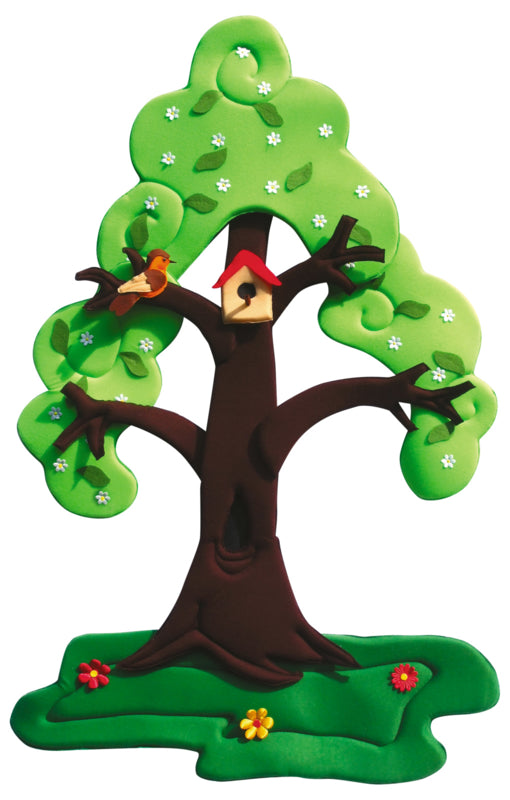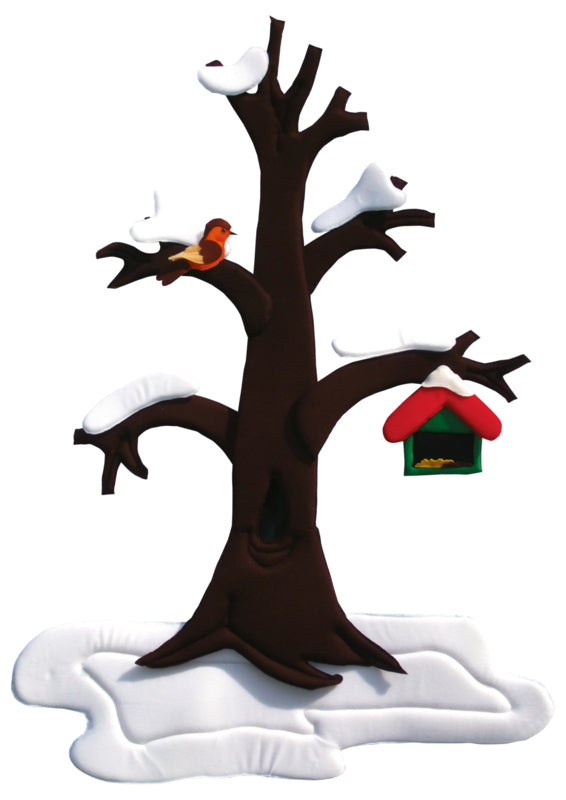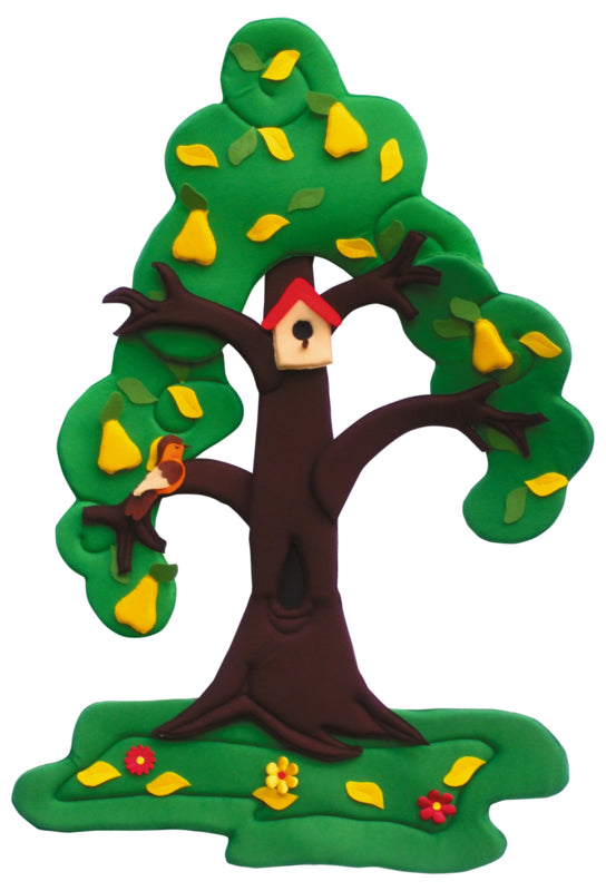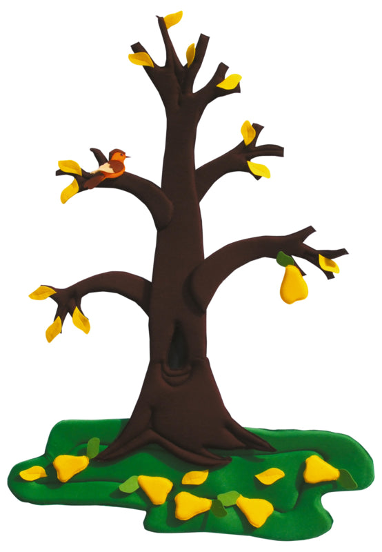 Genaaid van een zachte stof gevuld met foam. De perenboom is niet alleen een opvallende versiering voor het hele jaar door, maar ook een praktisch leermiddel dat kinderen helpt de veranderingen in de natuur te begrijpen. Dankzij de tweezijdige vastgemaakte boomtop met klittenband bloeit de boom in de lente, in de zomer rijpt er fruit op, in de herfst vallen de bladeren naar beneden en in de winter is het bedekt met sneeuw. Er is een nestkast voor vogels opgehangen aan de boom en in de winter kunnen we er een vogelhuisje aan hangen. De set bevat verplaatsbare elementen: 3 delen van de tweezijdige boomtop, een lente links en een zomer rechts. 3 delen van tweezijdige boomtop (lente aan de ene kant en zomer aan de andere kant), 1 tweezijdig gras (aan de ene kant groen en witte sneeuw aan de andere kant), 15 groene bladeren, 5 peren, 3 bloemen, 1 vogel, 1 nestkast, 1 voederbak, 4 delen sneeuw.