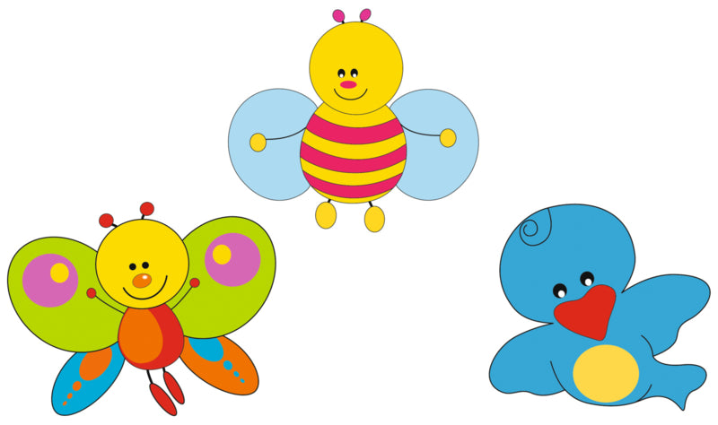 Set van 3 decoraties: vlinder (60 x 48 cm), bij (54,5 x 48,5 cm), vogel (51,5 x 48,5 cm)
