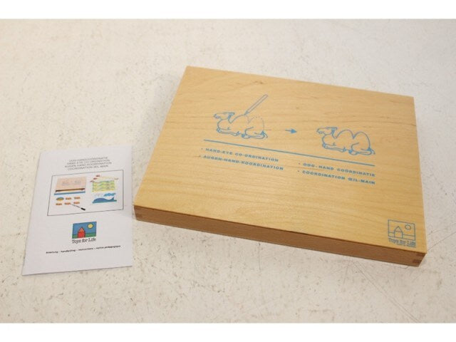 Inhoud: 15 dubbelzijdige bedrukte kaarten met in totaal 30 opdrachtreeksen, 1 uitwisbare viltstift en een handleiding opgeborgen in een mooie houten kist.
