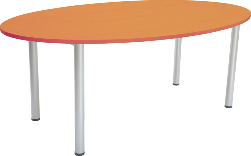 Tafel op metalen frame, met ronde poten in aluminiumkleur, met tafelblad van gelamineerd spaanplaat (dikte: 25 mm), randbanddikte: 2 mm.