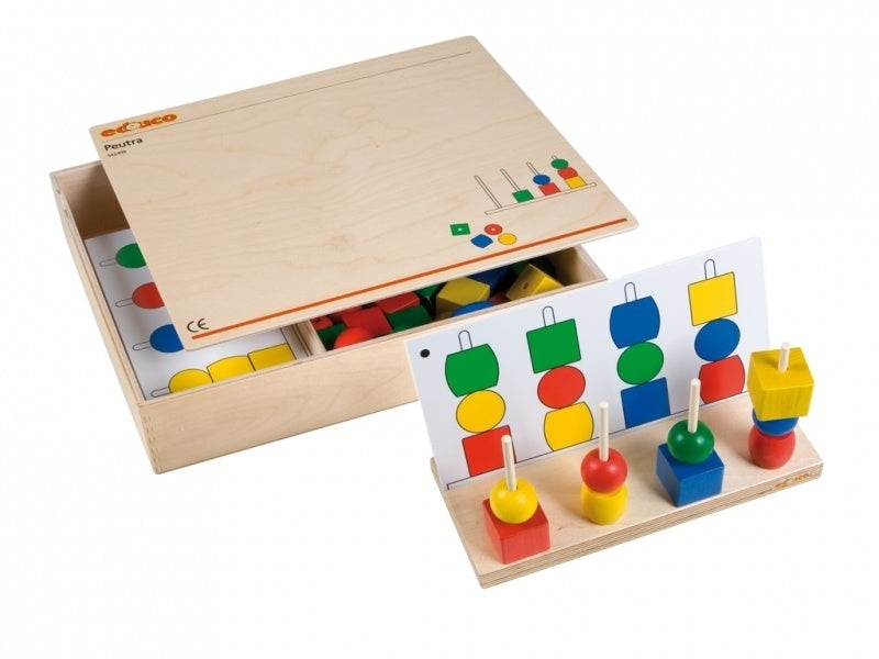 2 standaards, 48 grote houten kralen, 10 opdrachtkaarten (oplopend in moeilijkheid).
