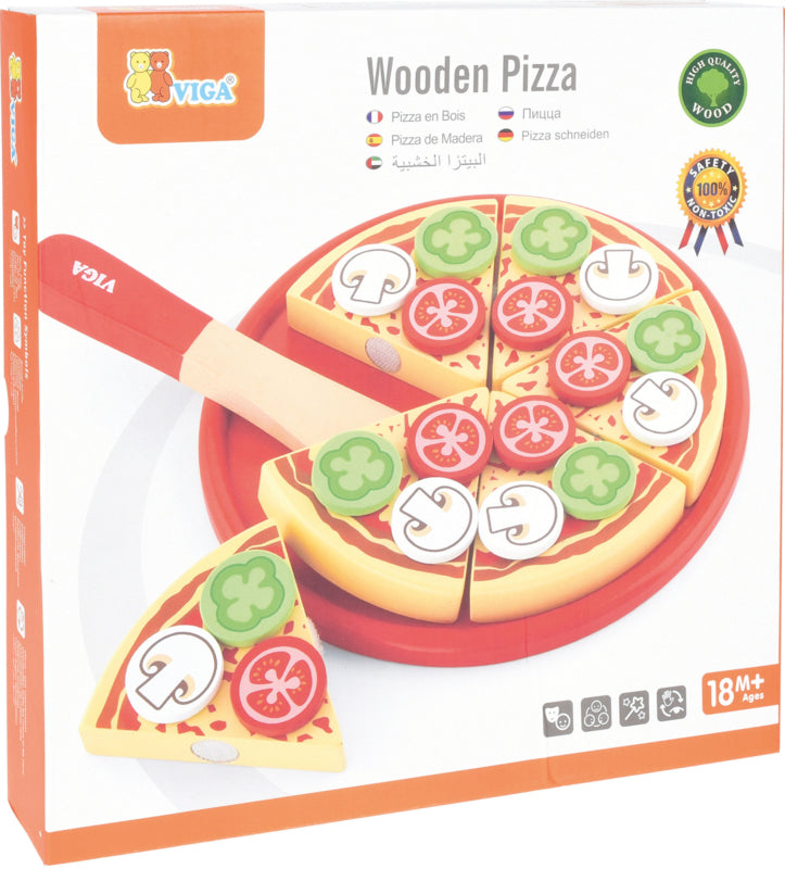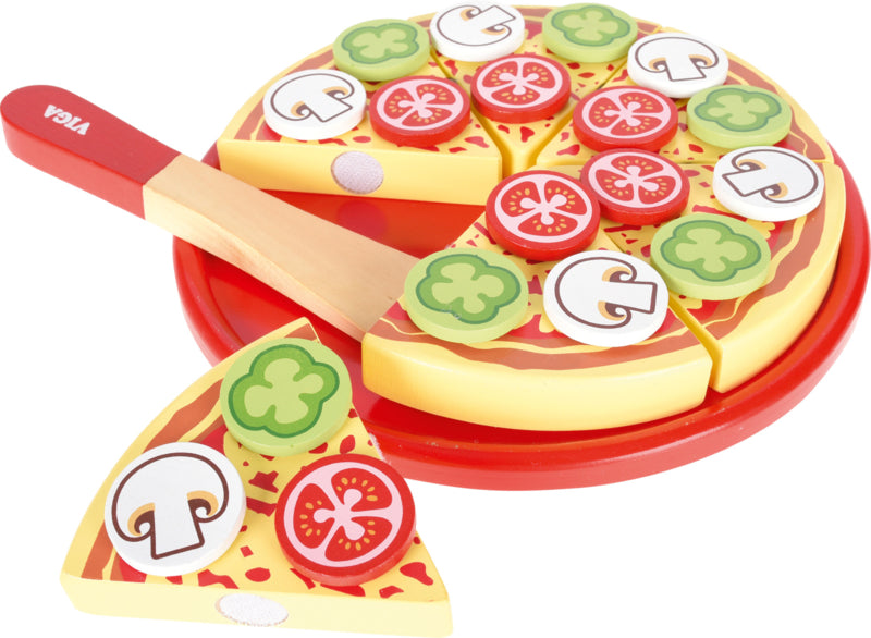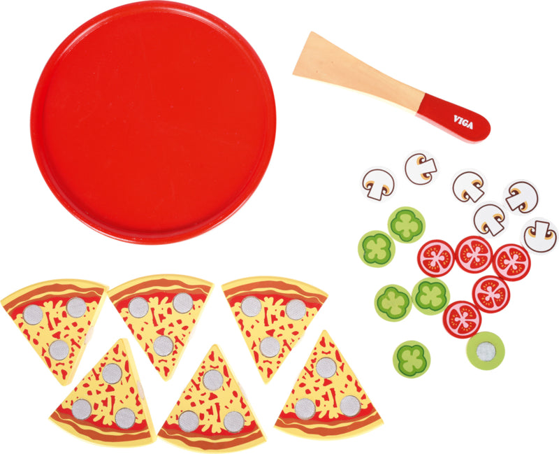 Houten pizza verdeeld in 6 stukken, met 3 soorten afneembare ingrediënten (tomaat, champignon, broccoli). Stukken pizza en ingrediënten combineren met klittenband.