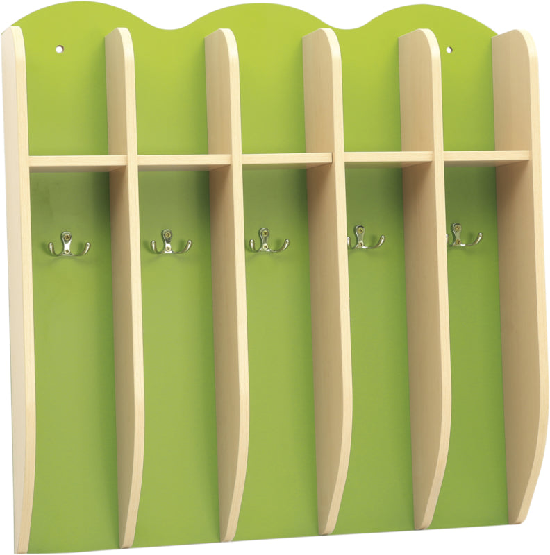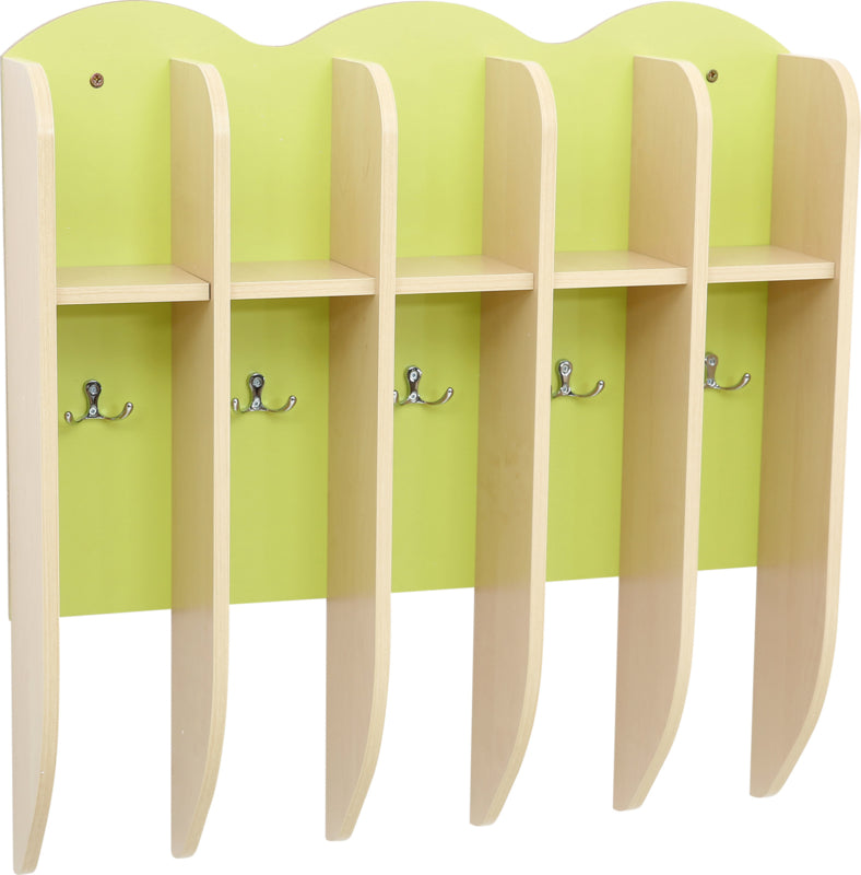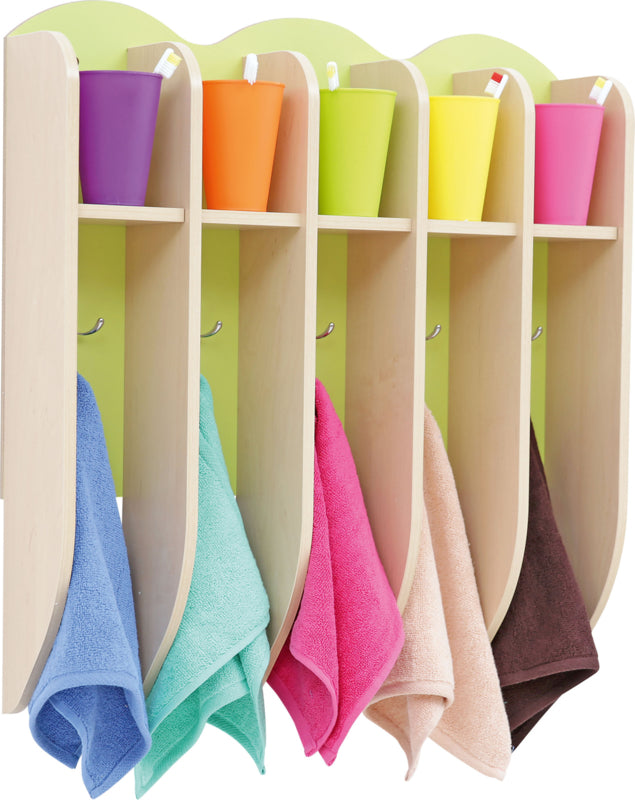 Plank met 5 dubbele haken bijv. voor handdoeken en ruimte voor 5 bekers (elk compartiment 11 cm), gemaakt van kleurrijke MDF-plaat en gelamineerd spaanplaat (dikte 1 cm).