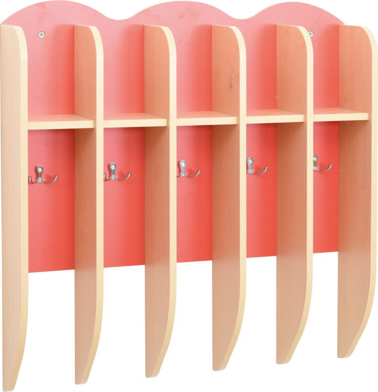 Plank met 5 dubbele haken bijv. voor handdoeken en ruimte voor 5 bekers (elk compartiment 11 cm), gemaakt van kleurrijke MDF-plaat en gelamineerd spaanplaat (dikte 1 cm).