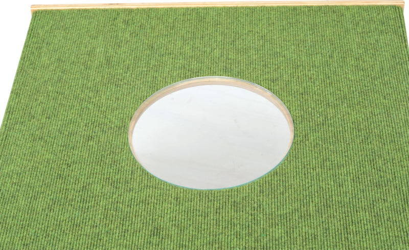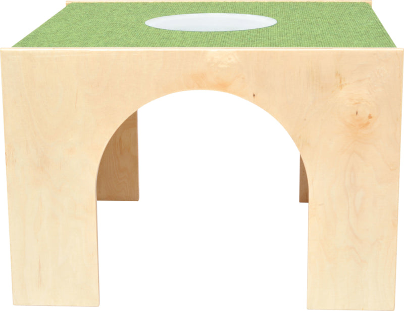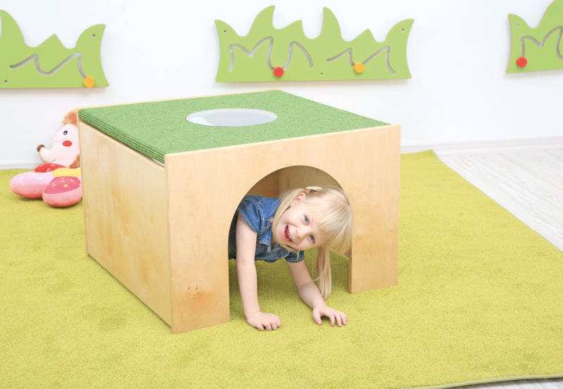 Platform van hout, voorzien van rubberen voetjes om krassen op de vloer te voorkomen. Bedekt met antislip tapijt.. In het middelste gedeelte bevindt zich een venster (diam. 25 cm). Opening aan twee kanten maken binnen kruipen mogelijk.