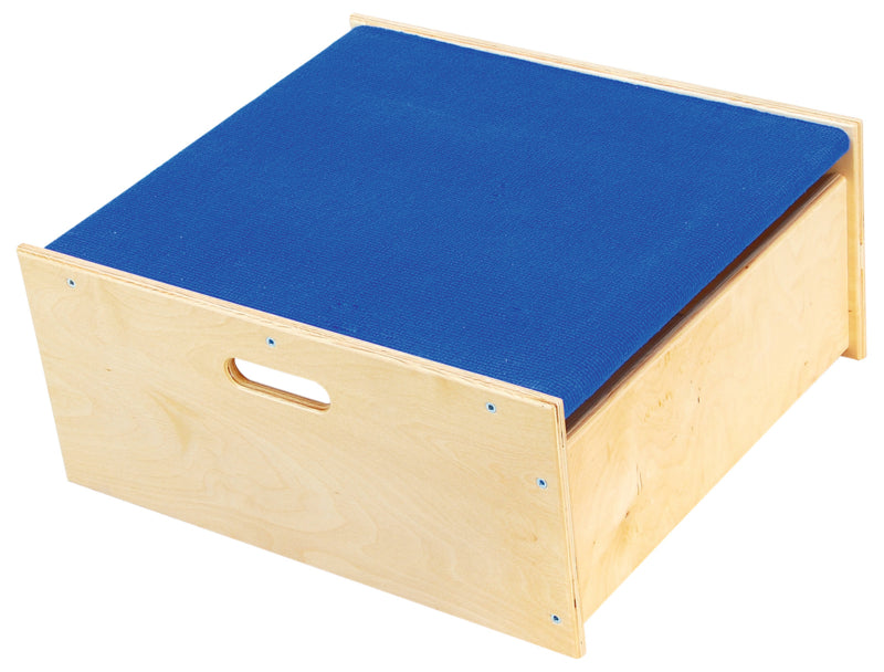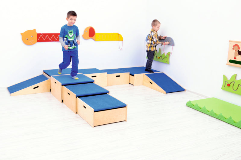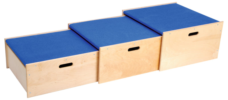 3 platforms in 3 verschillende hoogtes, gemaakt van hout, bedekt met antislip tapijt.