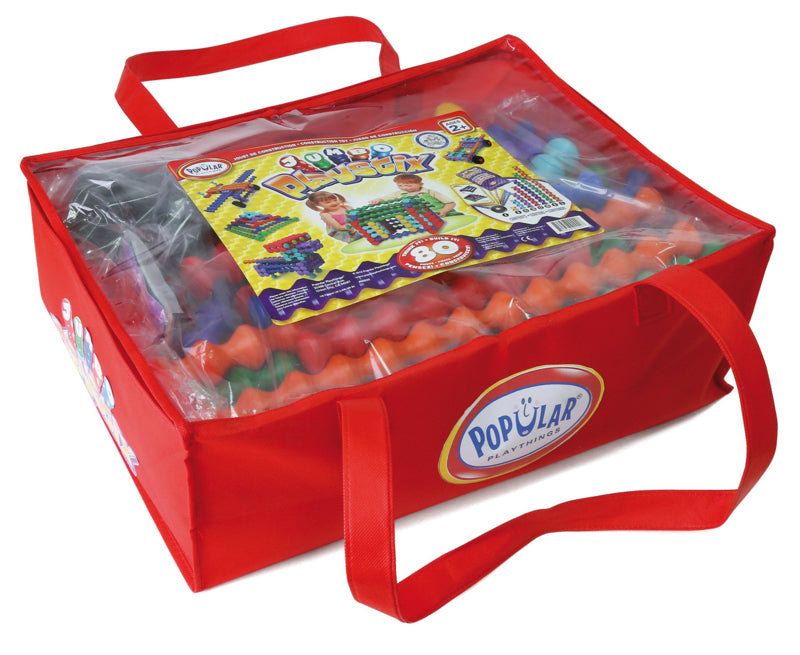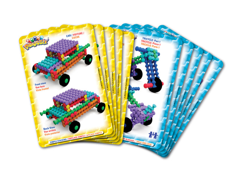 80 dlg. set in draagtas: 76 Plastix in 7 maten, 4 wielen en 10 voorbeeldkaarten.