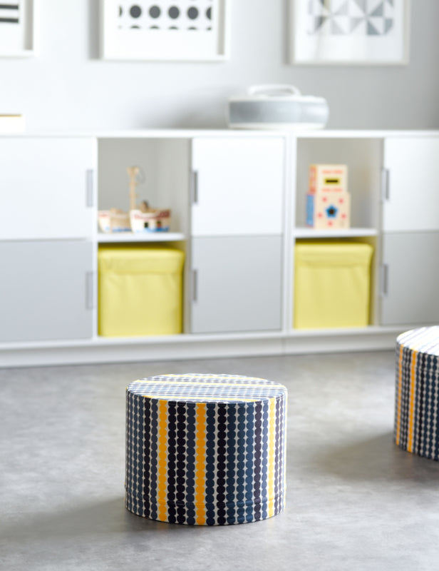 Ronde, comfortabele poefs in interessante kleuren, met cirkels, driehoeken of pijlen op de stof gedrukt. Gemaakt van foam bedekt met velours stof