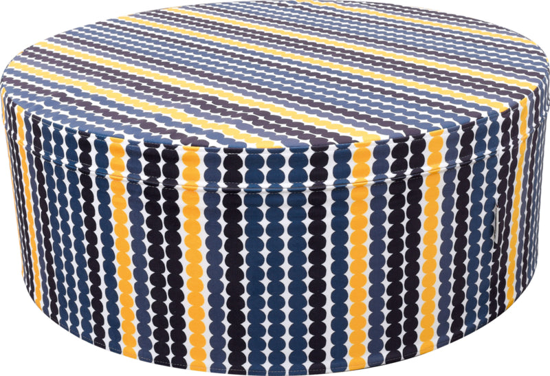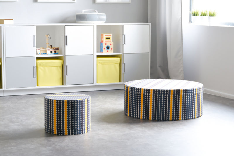 Ronde, comfortabele poefs in interessante kleuren, met cirkels, driehoeken of pijlen op de stof gedrukt. Gemaakt van foam bedekt met velours stof