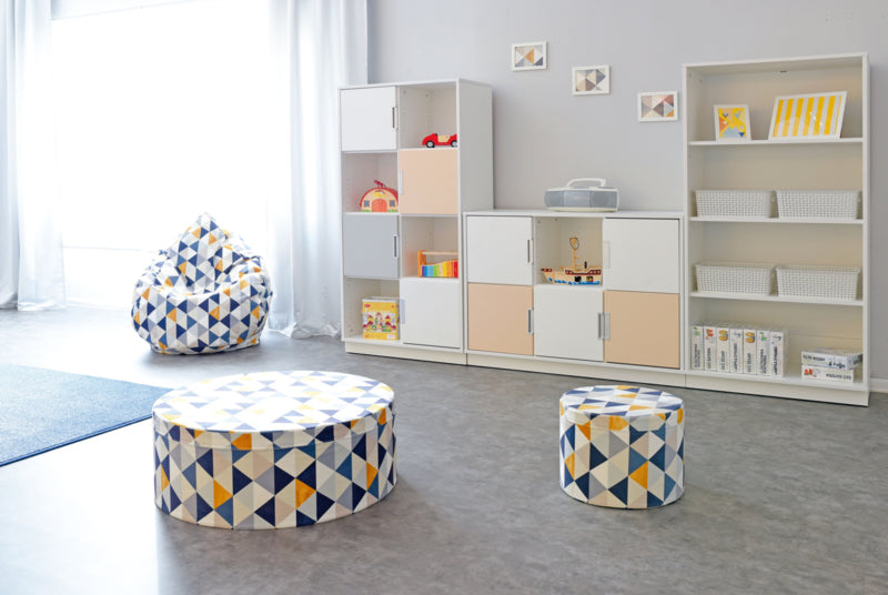 Ronde, comfortabele poefs in interessante kleuren, met cirkels, driehoeken of pijlen op de stof gedrukt. Gemaakt van foam bedekt met velours stof