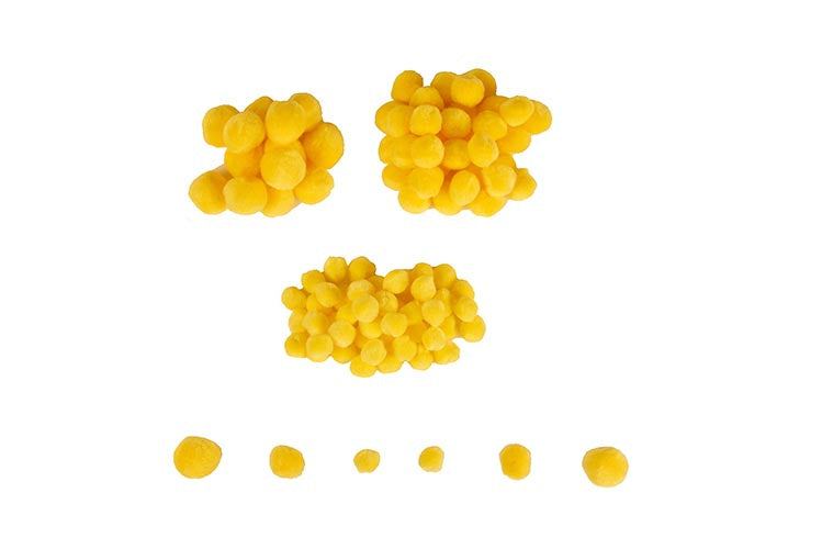 Zak met 100 blauwe pompons in 3 verschillende maten.