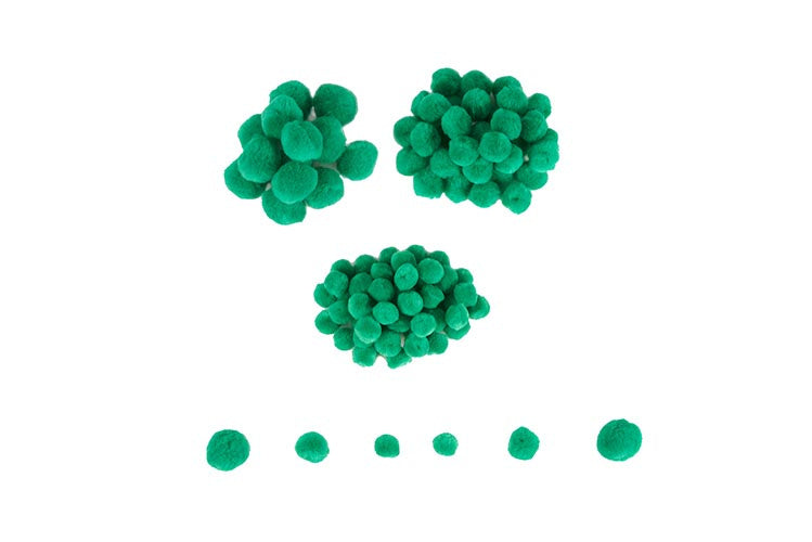 Zak met 100 blauwe pompons in 3 verschillende maten.
