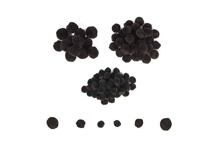 Zak met 100 blauwe pompons in 3 verschillende maten.