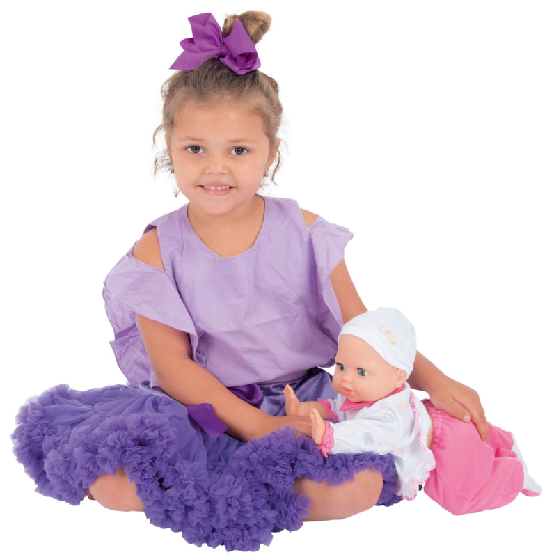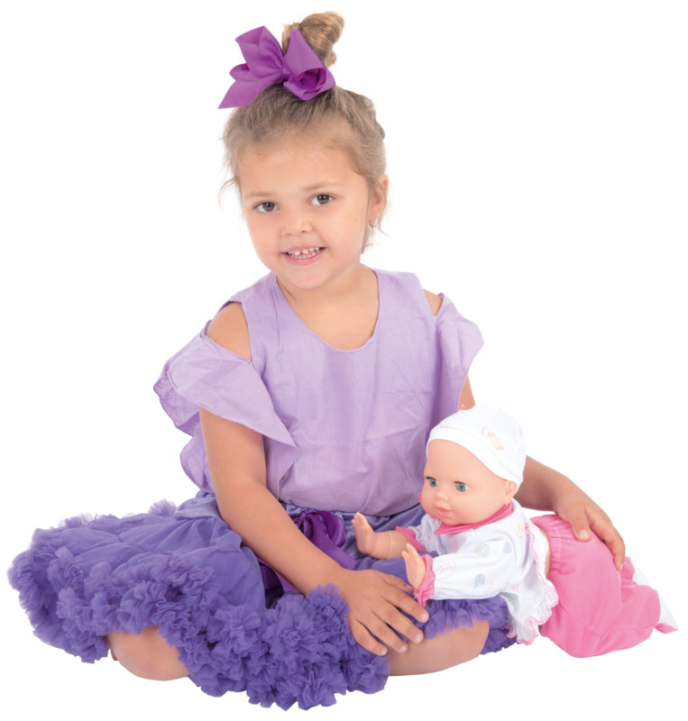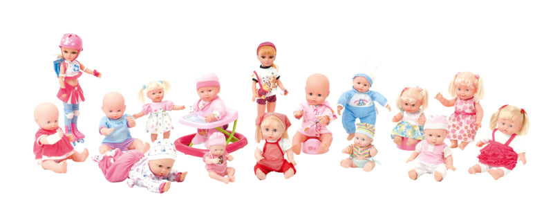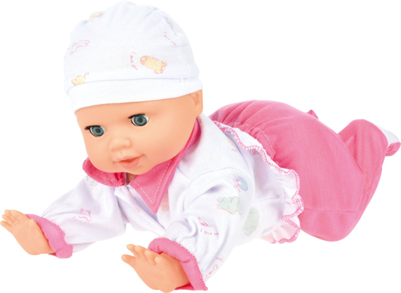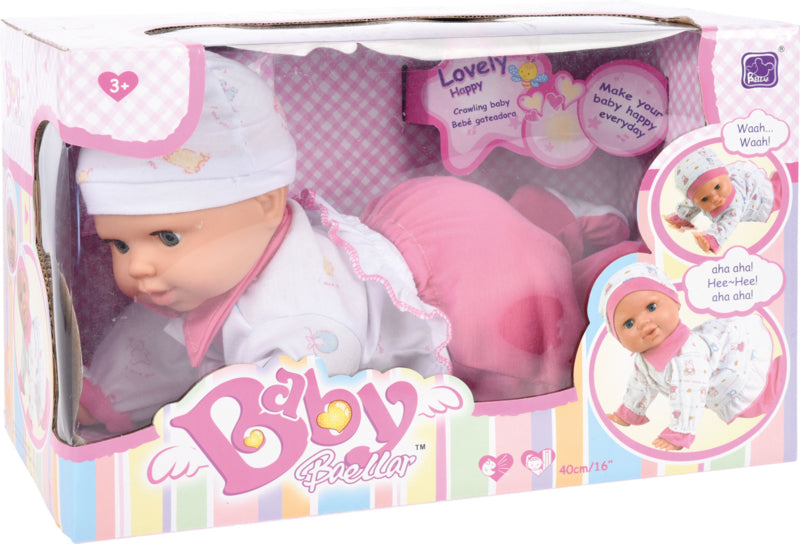 Plastic pop heeft beweegbare handen, benen, hoofd en oogleden en verwijderbare kleding. Na het inschakelen kruipt de baby, schudt het hoofd en maakt geluiden.