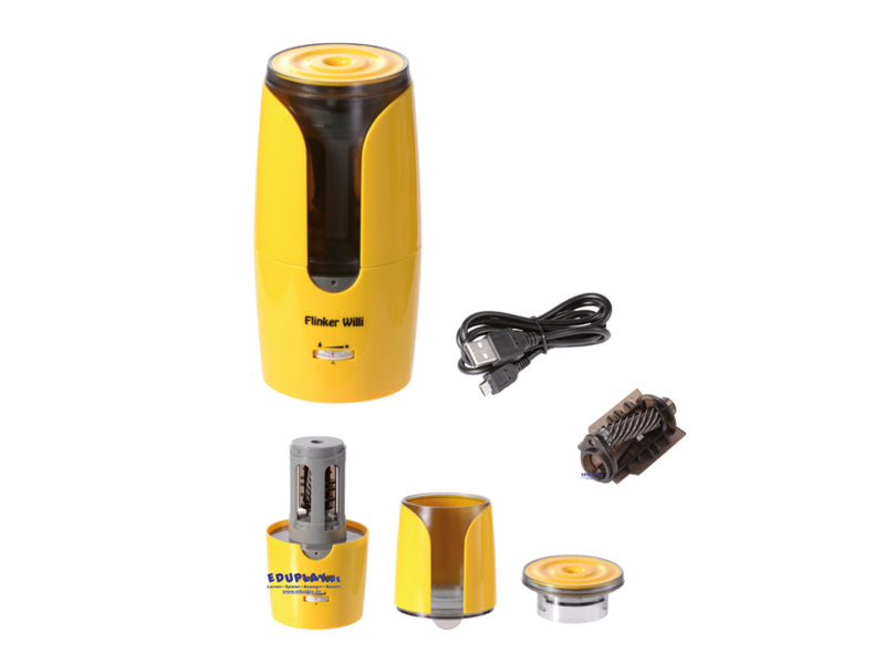 Scherpe punten in enkele seconden.....Met de elektrische high-speed slijper met spindelfreesmachine is dit een echte aanrader. Het is geschikt voor alle grafiet- en kleurpotloden met een doorsnede van 6-12 mm. De opening aan de bovenkant biedt plaats aan alle vormen: rond, zeshoekig of driehoekig - zelfs houtvrije massieve potloden. Tijdens het gebruik gaat het signaallampje branden. Als de punt perfect is, stopt het apparaat. De puntscherpte is instelbaar via het draaiwiel. De grote en goed afgesloten opvangbak is eenvoudig te legen en de meegeleverde freesunit is vervangbaar (art. 240255).