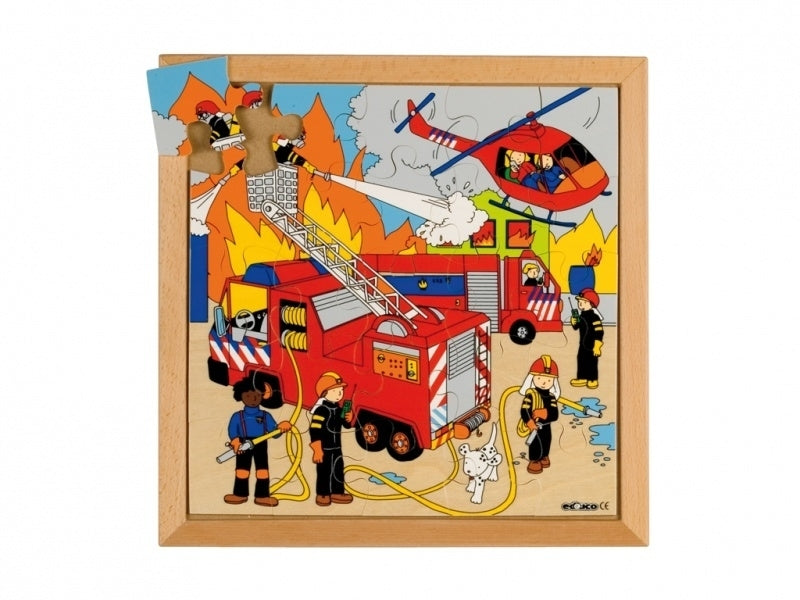 U krijgt geleverd: 1 puzzel Educo actie - brand in een houten frame.