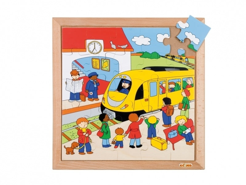 U krijgt geleverd: 1 puzzel Educo verkeer - station in een houten frame.