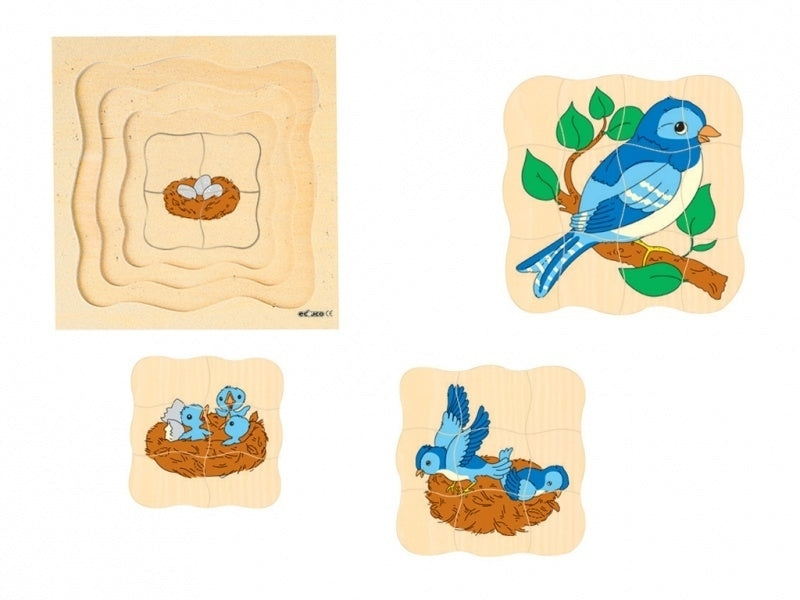 Puzzels die in vier fasen de ontwikkeling van ei tot vogel laat zien. Deze groeipuzzel is niet alleen om mee te puzzelen, maar ook aanleiding tot een boeiend kringgesprek.