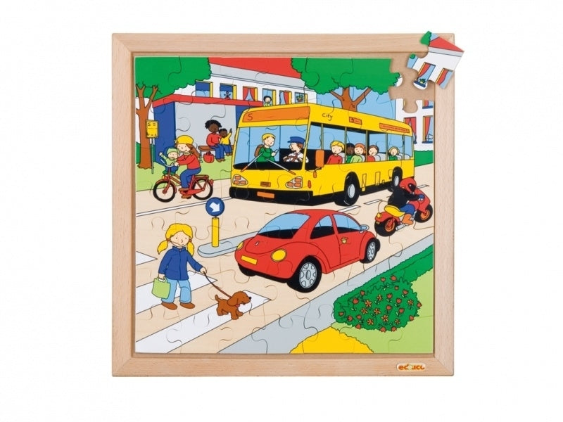 U krijgt geleverd: 1 puzzel Educo verkeer - de weg in een houten frame.