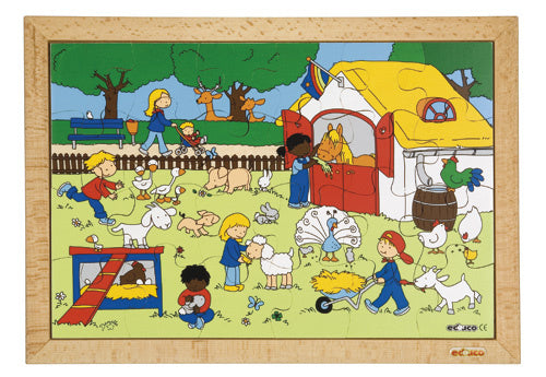 U krijgt geleverd: 1 puzzel Educo kinderen - kinderboerderij in een houten frame.