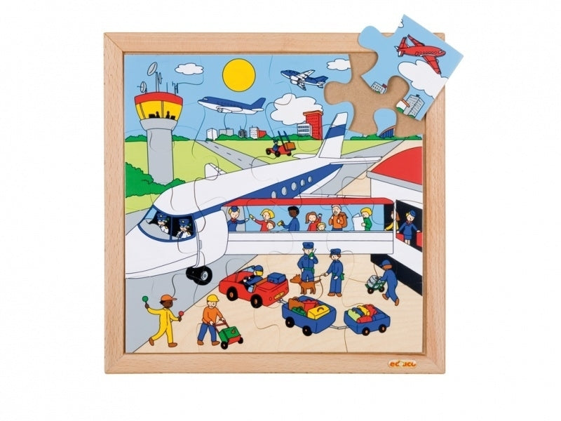 U krijgt geleverd: 1 puzzel Educo verkeer - luchthaven in een houten frame.