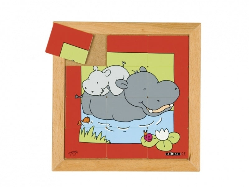U krijgt geleverd: 1 puzzel Educo moeder en kind- nijlpaard in een houten frame.