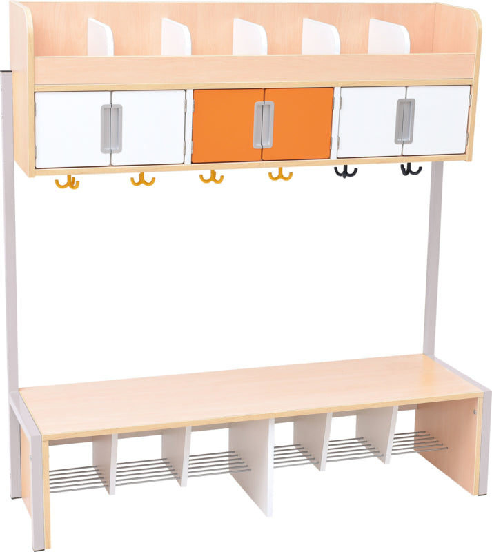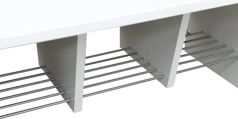 Garderobe gemaakt van gelamineerd spaanplaat in een esdoorn kleur of wit (dikte 18 mm.) op een stabiel metalen frame.