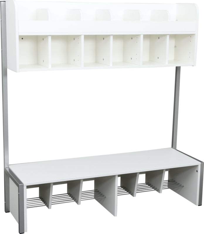 Garderobe gemaakt van gelamineerd spaanplaat in een esdoorn kleur of wit (dikte 18 mm.), op een stabiel metalen frame.
