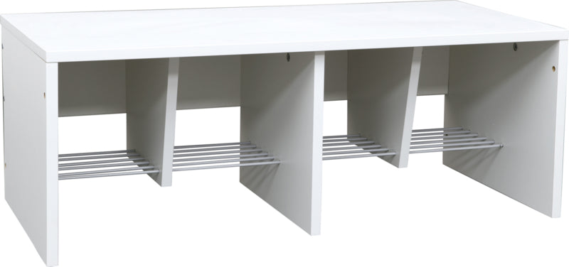 Garderobebank gemaakt van gelamineerd spaanplaat in een esdoorn kleur of wit (dikte 18 mm.) met schoenenplank.