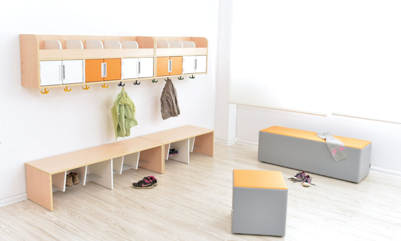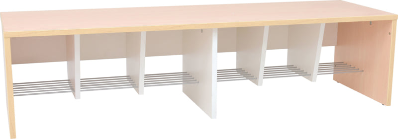 Garderobebank gemaakt van gelamineerd spaanplaat in een esdoorn kleur of wit (dikte 18 mm.) met schoenenplank.