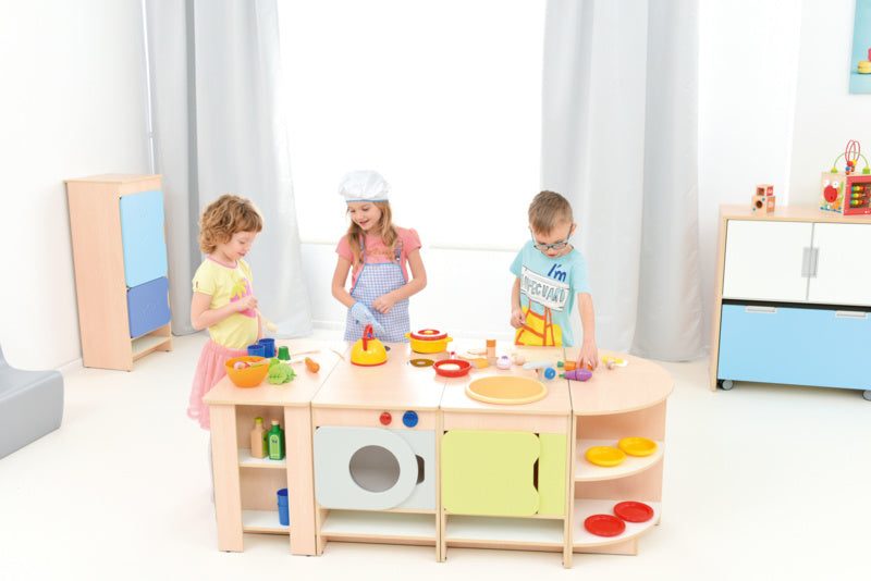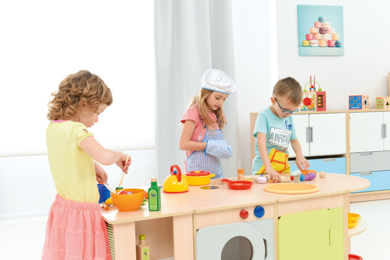 Quadro keukens zijn er om de thuissituatie na te spelen,wat groepsintegratie ontwikkelt. Kinderen communiceren en werken samen tijdens dit fanasiespel.