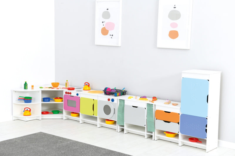 Quadro keukens zijn er om de thuissituatie na te spelen,wat groepsintegratie ontwikkelt. Kinderen communiceren en werken samen tijdens dit fanasiespel.