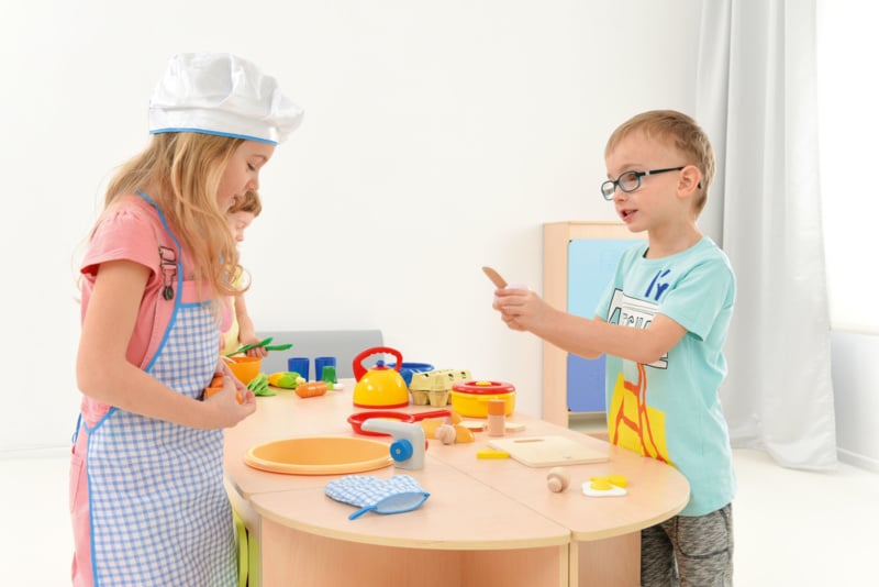Quadro keukens zijn er om de thuissituatie na te spelen,wat groepsintegratie ontwikkelt. Kinderen communiceren en werken samen tijdens dit fanasiespel.