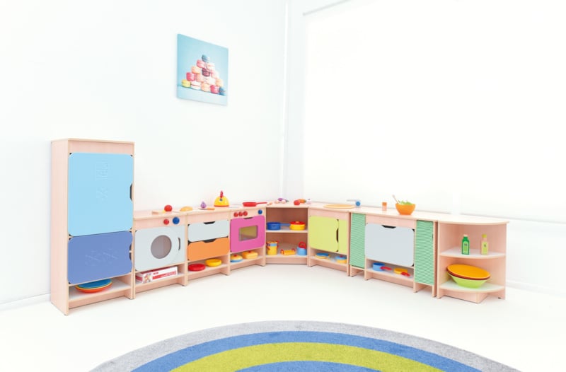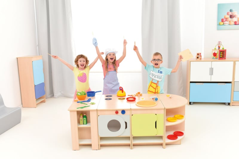 Quadro keukens zijn er om de thuissituatie na te spelen,wat groepsintegratie ontwikkelt. Kinderen communiceren en werken samen tijdens dit fanasiespel.