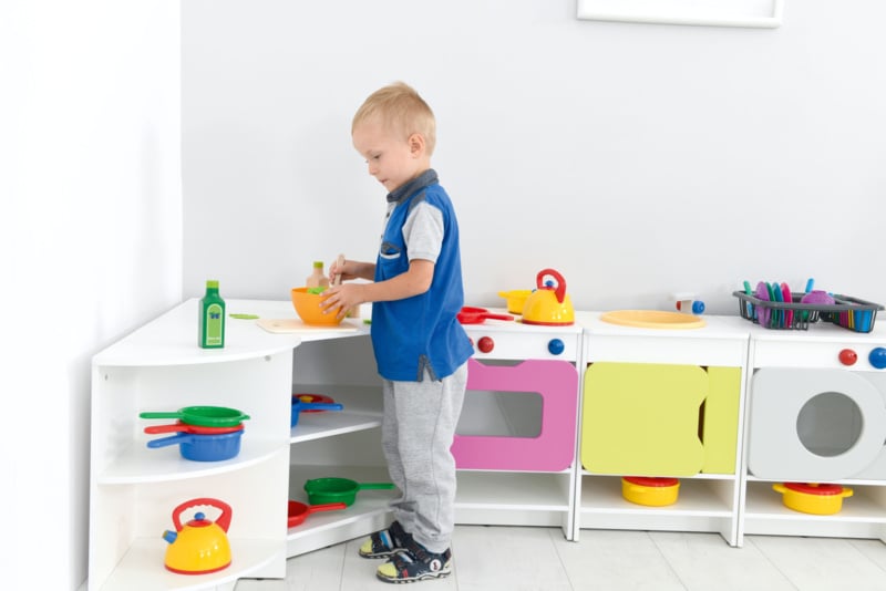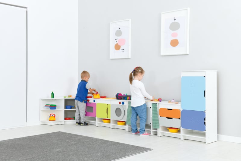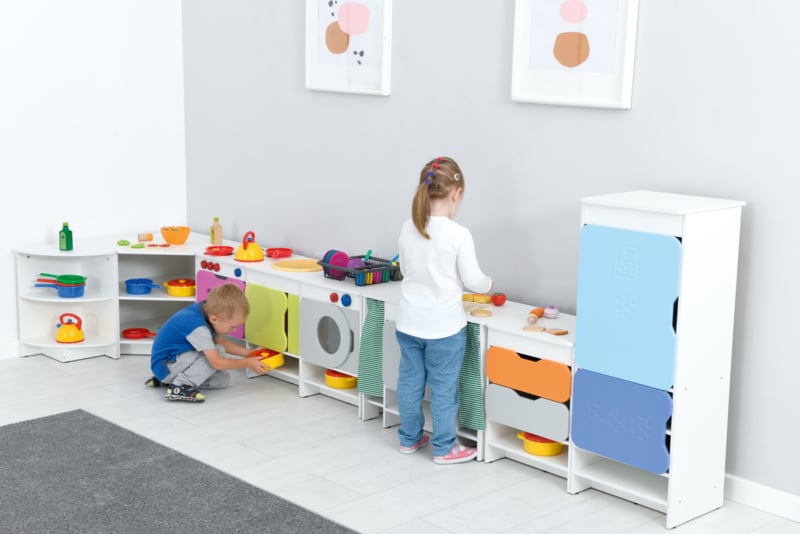 Quadro keukens zijn er om de thuissituatie na te spelen,wat groepsintegratie ontwikkelt. Kinderen communiceren en werken samen tijdens dit fanasiespel.