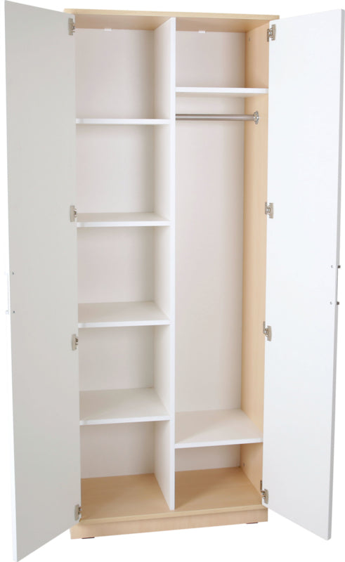 Kledingkast met scheidingswand. Aan de ene kant twee planken (boven en onder) en twee stoffen hangers, aan de andere kant vier planken.