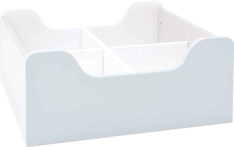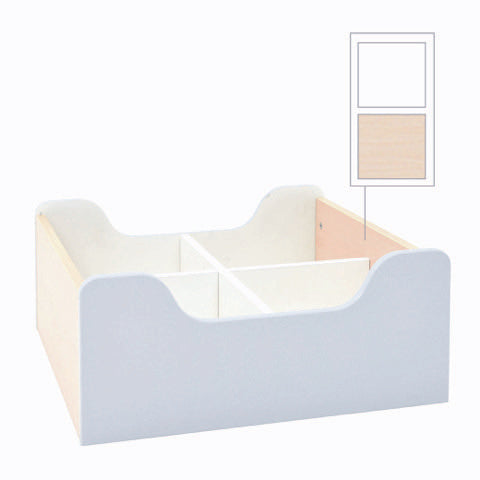 Bak met 4 compartimenten, gemaakt van wit of esdoorn/wit gelamineerd spaanplaat en grijze MDF-plaat.