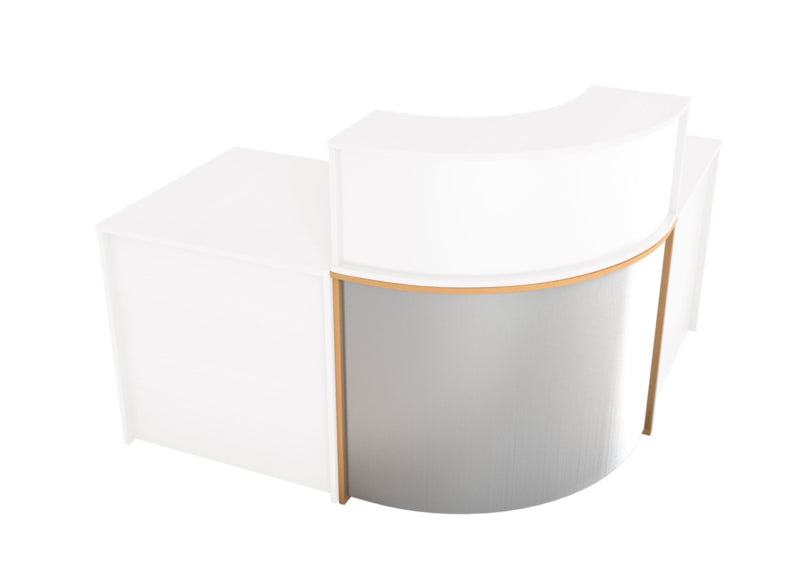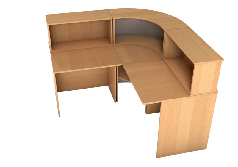 Receptie hoek van gelamineerd spaanplaat in een beuken of esdoorn kleur (dikte 18 mm.) met randafwerking. Het is mogelijk om verschillende combinaties van diverse elementen te maken: met niveauverhogers, recht bureau, hoek bureau. Een deel van de hoek receptie is bedekt met laminaat in aluminium kleur.
