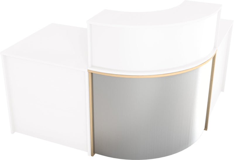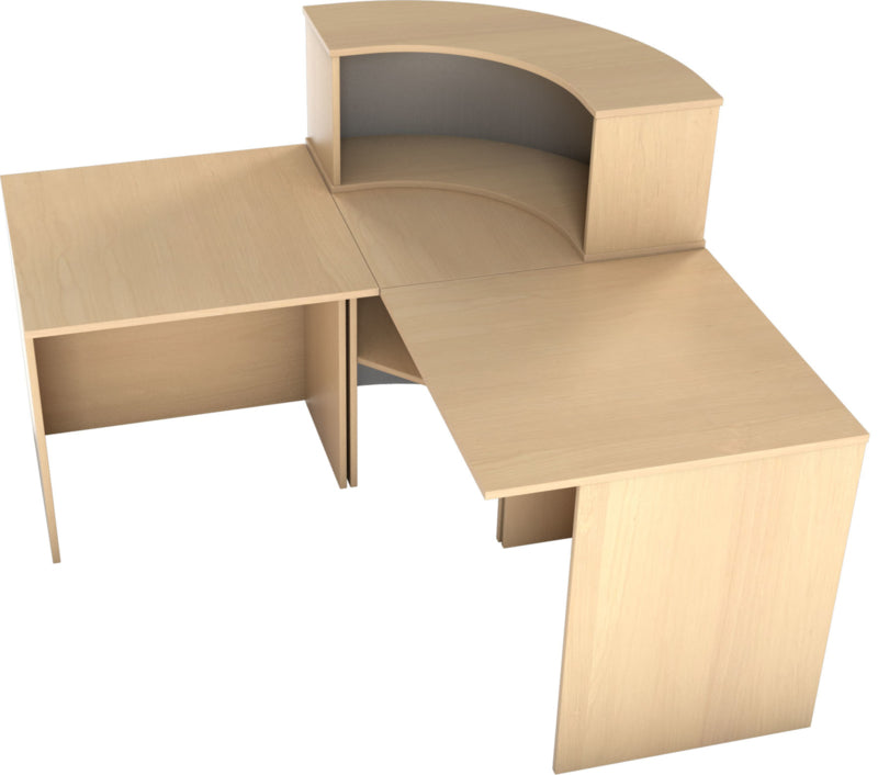Receptie hoek van gelamineerd spaanplaat in een beuken of esdoorn kleur (dikte 18 mm.) met randafwerking. Het is mogelijk om verschillende combinaties van diverse elementen te maken: met niveauverhogers, recht bureau, hoek bureau. Een deel van de hoek receptie is bedekt met laminaat in aluminium kleur.