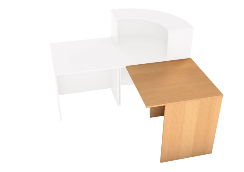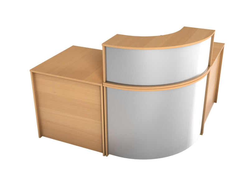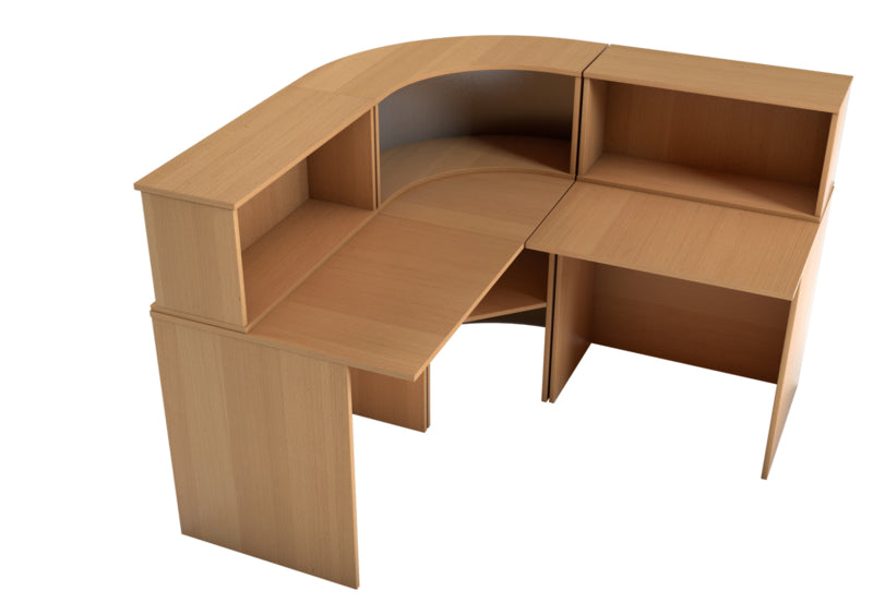 Receptie balie op metalen frame met tafelblad van gelamineerd spaanplaat in een beuken of esdoorn kleur (dikte 18 mm.) met randafwerking. Het is mogelijk om verschillende combinaties van diverse elementen te maken: met niveauverhogers, recht bureau, hoek bureau. Een deel van de hoek receptie is bedekt met laminaat in aluminium kleur.