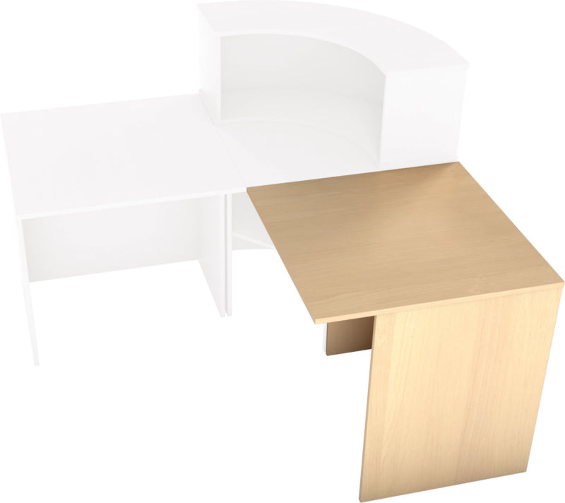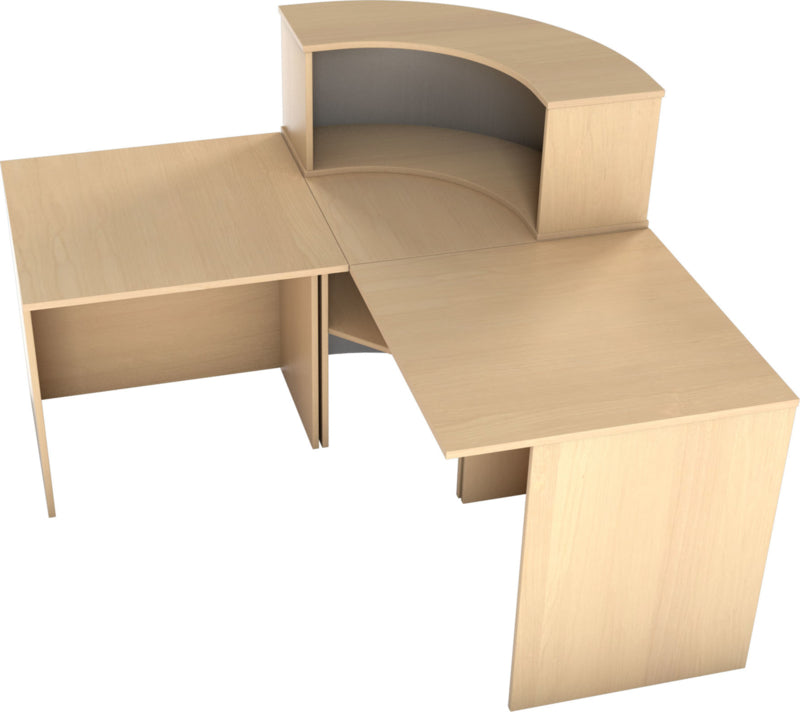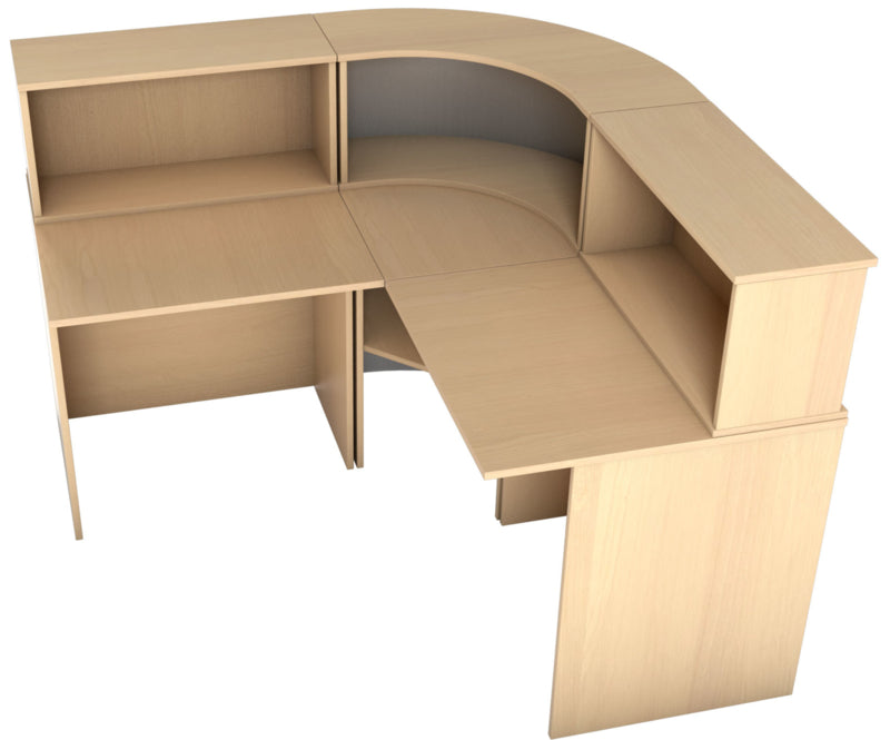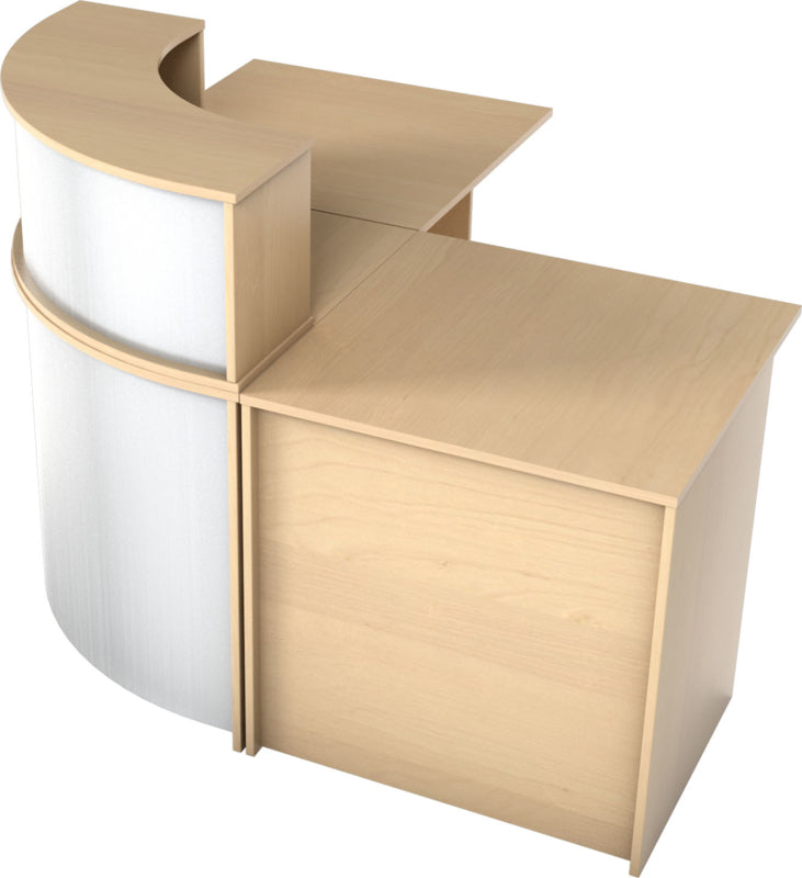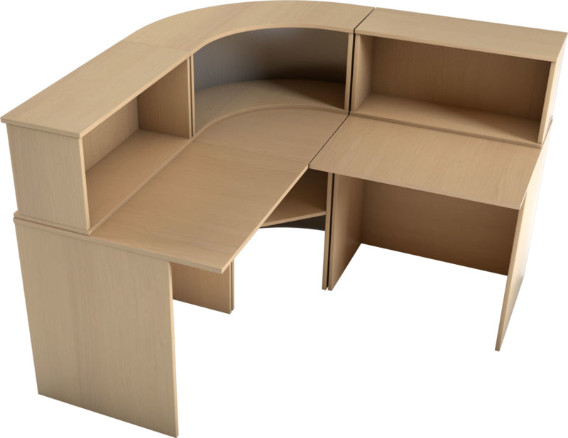 Receptie balie op metalen frame met tafelblad van gelamineerd spaanplaat in een beuken of esdoorn kleur (dikte 18 mm.) met randafwerking. Het is mogelijk om verschillende combinaties van diverse elementen te maken: met niveauverhogers, recht bureau, hoek bureau. Een deel van de hoek receptie is bedekt met laminaat in aluminium kleur.