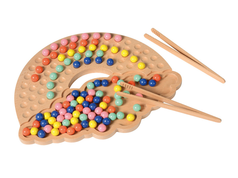 Een of twee kinderen kunnen het regenboogvormige spelbord vullen met de kleurrijke houten ballen of gekleurde patronen leggen. Vingers of twee houten pincetten kunnen voor dit doel worden gebruikt - in elk geval traint het vastpakken en neerleggen ervan de fijne motoriek en hand-oogcoördinatie. Inhoud: spelbord, 2 tangen, 110 knikkers in 5 kleuren.