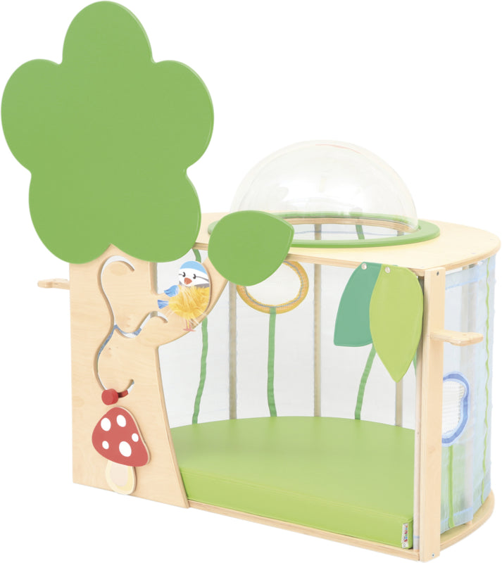 De relax ruimte is een ideale plek voor kinderen op zoek naar een rustige plek om te rusten en te ontspannen. Ze kunnen binnen zitten en op een zachte matras spelen. Het is uitgerust met vele attracties die kinderen intrigeren en hen veel plezier bezorgen. Zintuiglijke applicaties stimuleren het gezichtsvermogen en de tastzin en ontwikkelen ook de visueel-motorische coördinatie. Naast de ingang is een boom met doolhof en sensorische toepassingen met verschillende texturen. De halfronde wand is bedekt met een dunne stof, wat zorgt voor oogcontact tussen het kind en de rest van de kamer. Op het bovenste gedeelte bevindt zich een grote patrijspoort (diam. 49 cm). De relax ruimte is gemaakt van gelakt multiplex en MDF-plaat