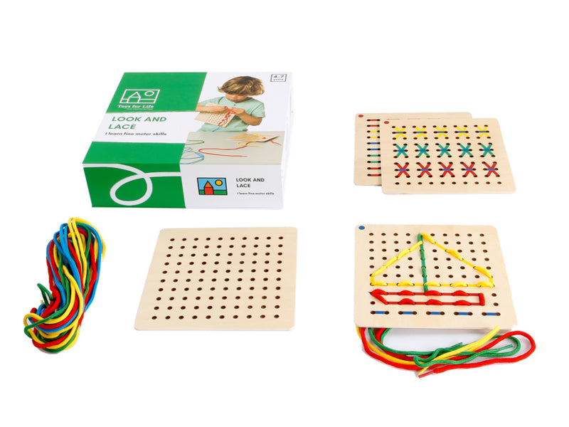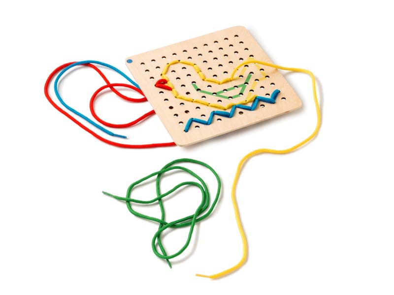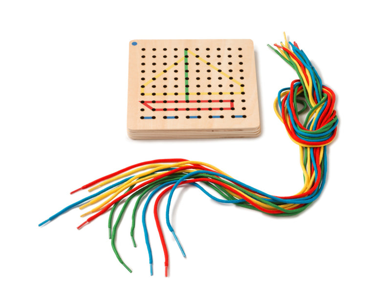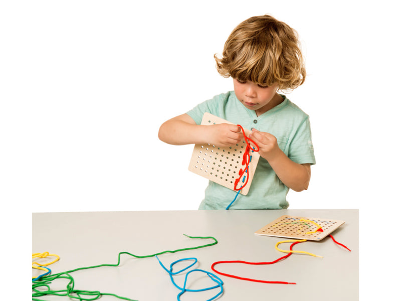 Maak kleurrijke patronen door veters door de taakplankjes te rijgen of gebruik eigen ontwerpen. Bevordert de fijne motoriek.
