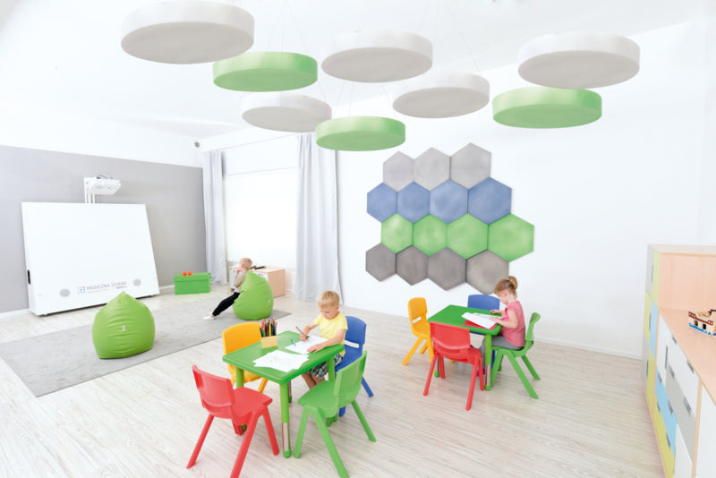 Ronde, decoratieve geluiddempende panelen om aan het plafond te hangen. De panelen zorgen ervoor dat het kind zich gemakkelijker op de taak kan concentreren, door de hoeveelheid auditieve stimulatie te beperken. Ideaal voor kinderen met concentratie- en aandachtsproblemen of auditieve verwerkingsstoornissen. Panelen gemaakt van polyurethaanfoam.