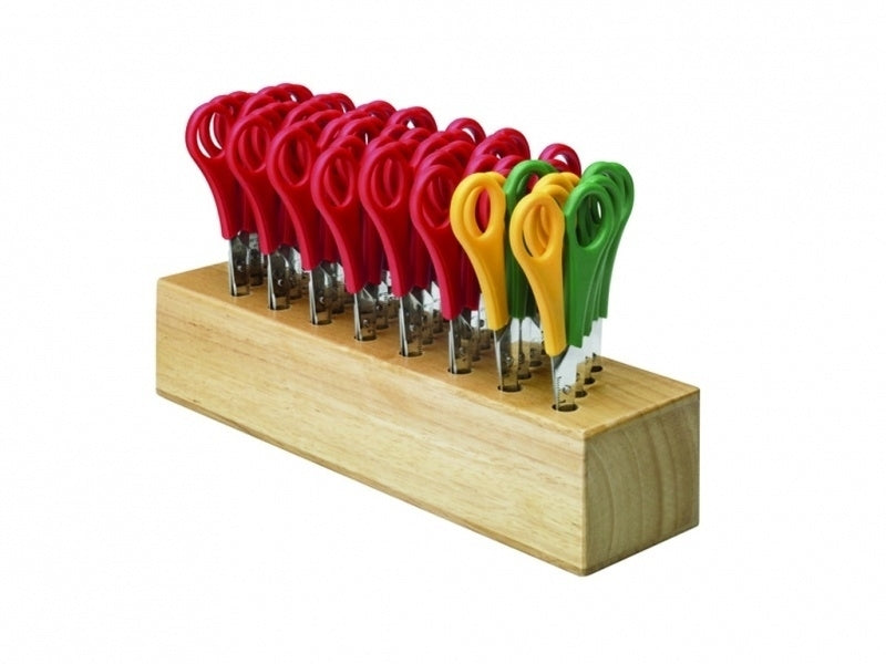 Scharenblok hout gevuld met 32 scharen: 6 linkshandig en 26 rechtshandig