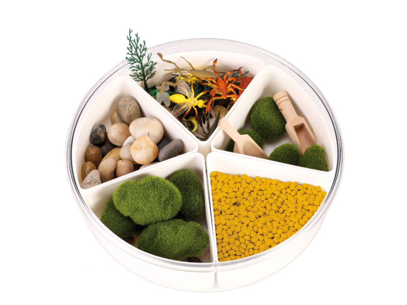 Met stenen van verschillende groottes, dieren, planten en kunstmos kunnen kinderen hun eigen wereld creëren in de grote transparante kom of op het deksel. De materialen met een grote verscheidenheid aan oppervlakken, vormen en kleuren stimuleren de tastzin en bevorderen de cognitieve vaardigheden bij het spelen, kijken en verkennen. De pedagogisch waardevolle sensorische boxen kunnen ook worden gecombineerd: op een lichttafel met een kleurwissel of door de schaal met water te vullen. De set bevat een grote, transparante kom met vijf driehoekige kommen waarin de materialen worden gesorteerd. Het grote transparante deksel sluit de set af - hij kan ook worden gebruikt om mee te spelen en te sorteren.