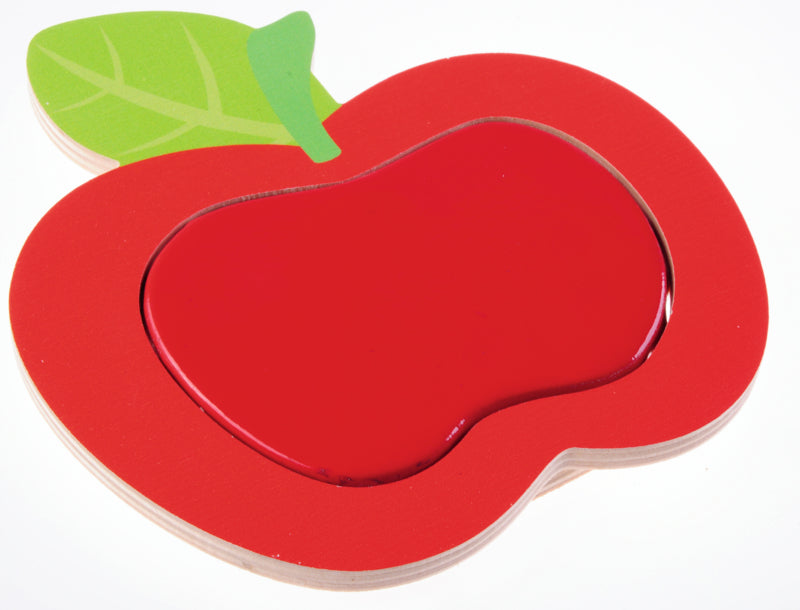 De appel is bedekt met een gladde PVC-stof.Gelakt multiplex (kleuren: groen, rood)Afm. 14 x 13,5 cm