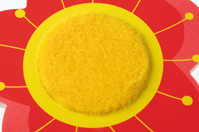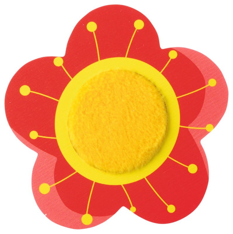 Het midden van de bloem is bedekt met een stof die een korte vacht imiteert. Gelakt multiplex (kleuren: geel, rood) Afm. 14 x 13,5 cm Dit element is voorzien van magnetische elementen en kan gebruikt worden op bijvoorbeeld de boom, hekjes , weide of rolbak
